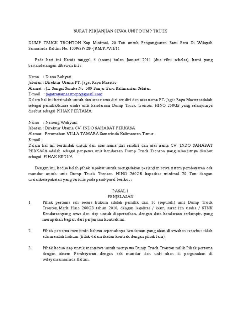 Contoh Loi Sewa Dump Truck / SURAT PERJANJIAN SEWA MOBIL BULANAN.docx / Draft kontrak berikut adalah yang saya pakai untuk perjanjian sewa armada untuk usaha angkutan batubara di batulicin.
